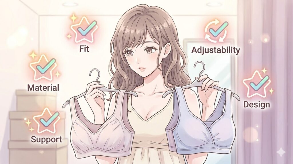 ここでは、重みのあるバストを朝までしっかり、かつ心地よく支え続けるための選び方の基準を、5つの視点から詳しく解説していきたいと思いますね。