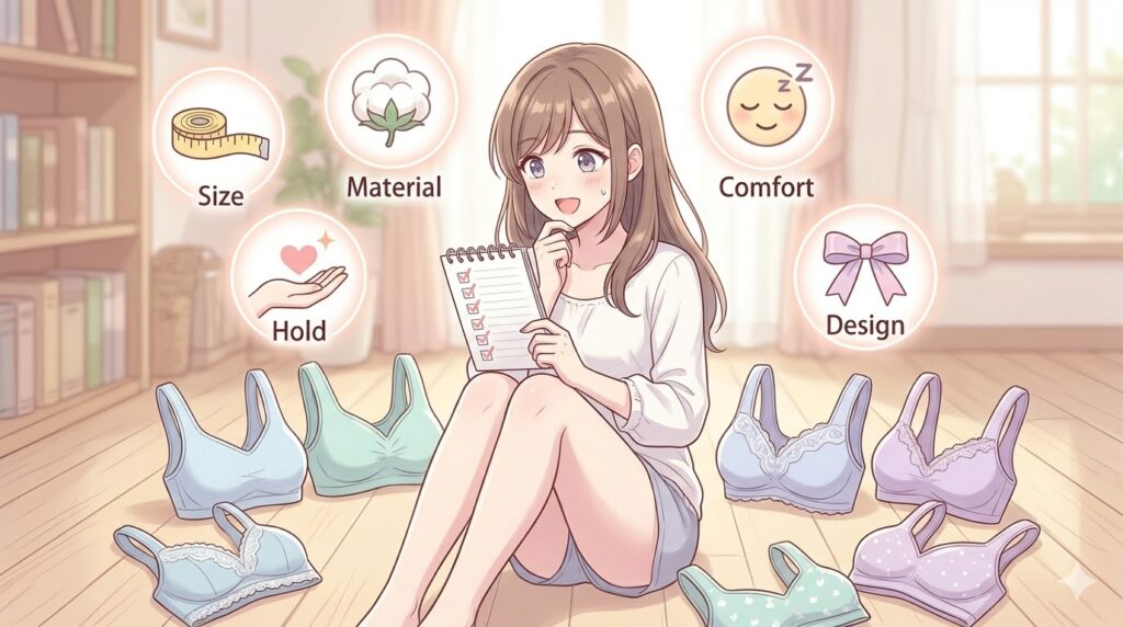 具体的なポイントは、Gカップ以上の大きい胸をしっかり支えるナイトブラの選び方で詳しく解説しています。