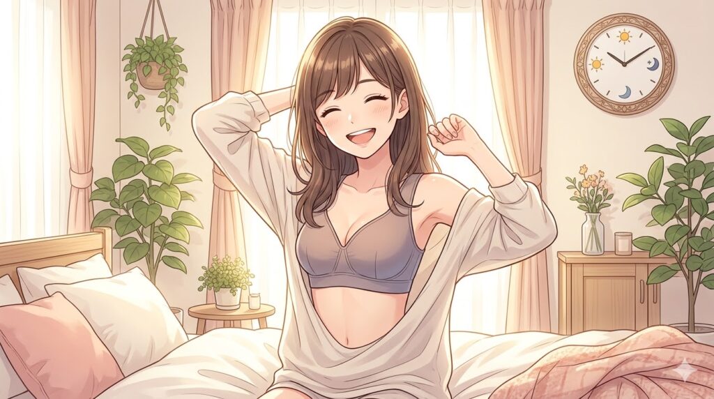 お風呂上がりにナイトブラを着けて、そのまま翌日の夕方まで心地よく過ごすというリズムは、一度経験すると手放せなくなるかもしれません。