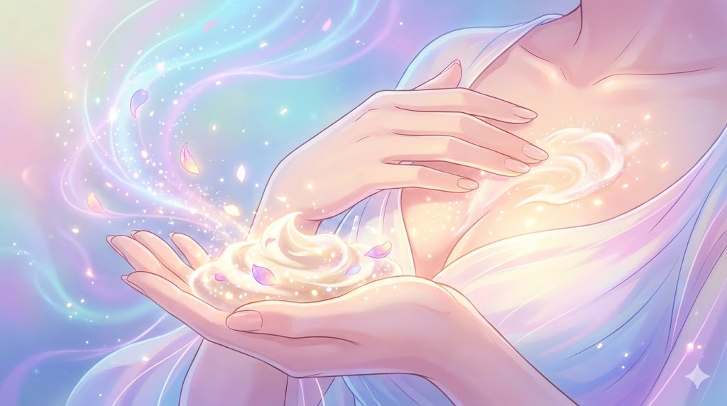 たっぷりのクリームを手に取り、肌に染み込ませるように丁寧に塗り込むことで、まるで見えないベールを纏ったような安心感が生まれますよね。
